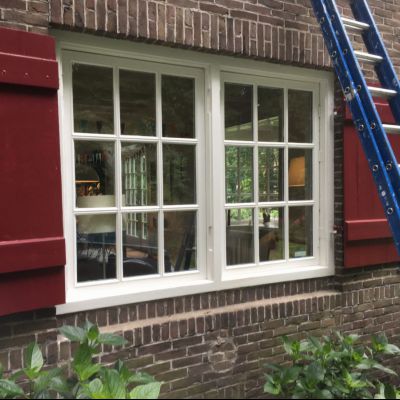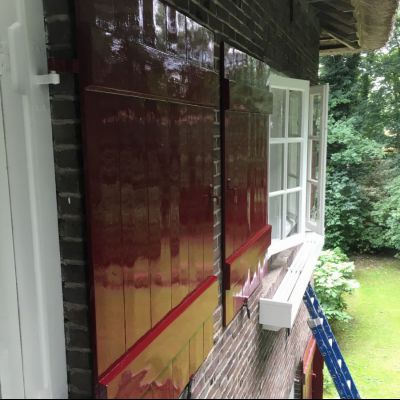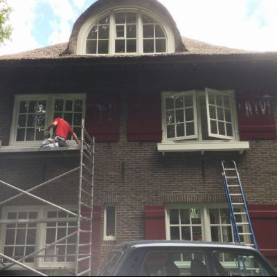 In opdracht van de bewoners van deze prachtige villa hebben wij groot onderhoud uitgevoerd aan al het buitenhoutwerk. Na het verwijderen van de oude verflagen en het uitvoeren van houtrotreparaties hebben een we een drielaags-verfsysteem aangebracht, waarmee het houtwerk er weer zes tot acht jaar tegenaan kan, tot de volgende (kleine) onderhoudsbeurt. De reactie van de opdrachtgever: “De manier van aanpak, werken en realisatie is zeer vakkundig en prettig.”